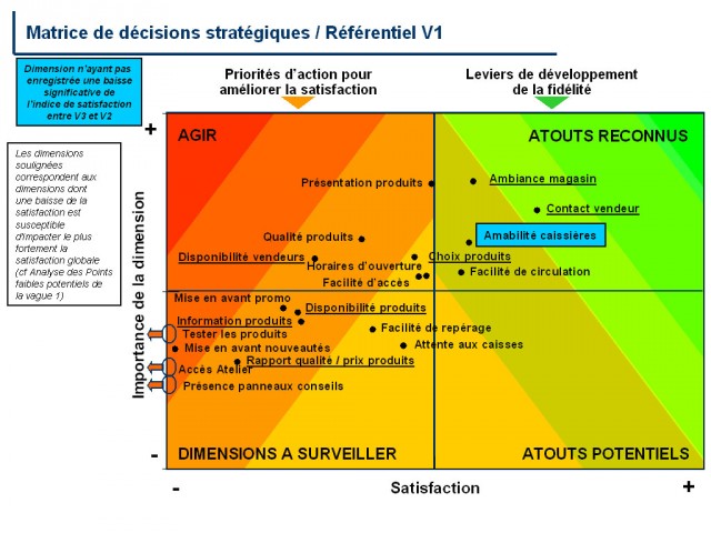 Une matrice telle que celle qui est en exemple plus haut permet de traduire les résultats de l’enquête en plans d’actions concrètes d’amélioration ou de maintien.